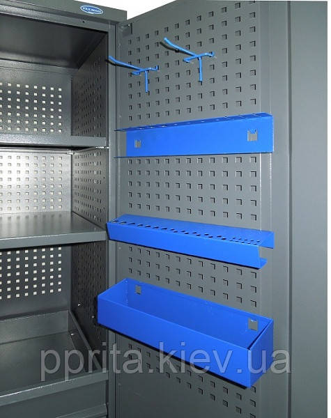 Шафа для інструменту комплектується трьома полицями та трьома шухлядами. Шафа інструментальна комплектується перфорованою задньою стінкою й перфорованими дверцятами.